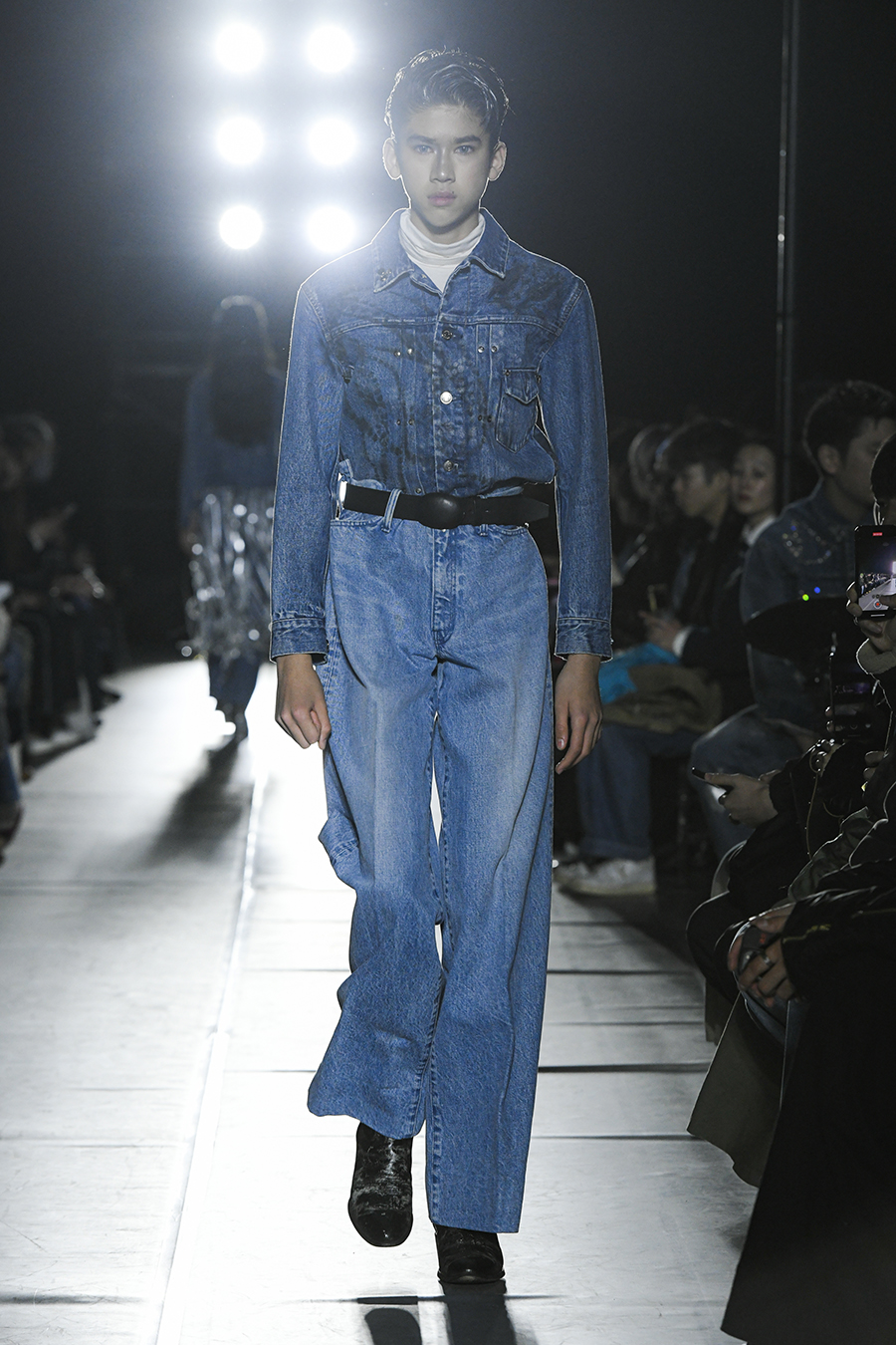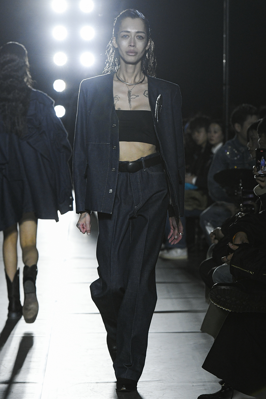강한 음악과 함께, 한 주먹을 불끈 쥐고 눈을 똑바로 뜨고 있습니다. 데님 꾸뛰르, 데님 아트.