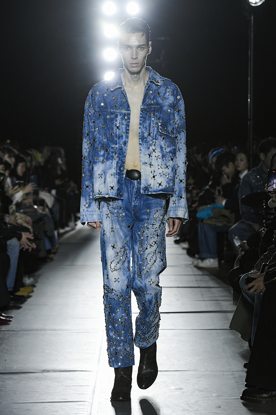 eagles, fringe skirts decorated with leather and crystals, leather-like coating denim.