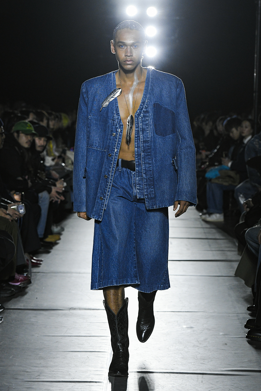 독수리, 가죽과 크리스탈로 장식된 프린지 스커트, 가죽 같은 코팅 데님.
