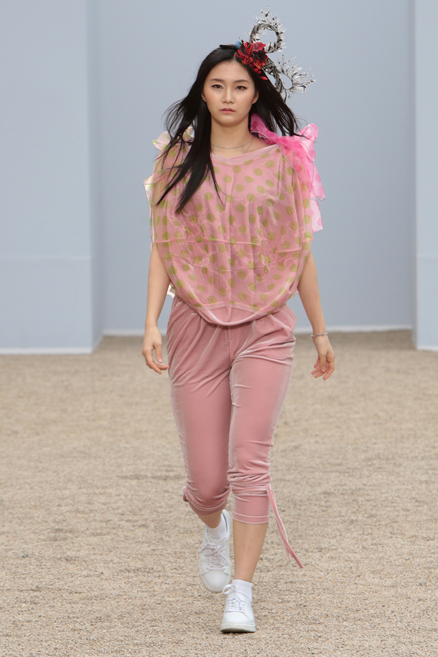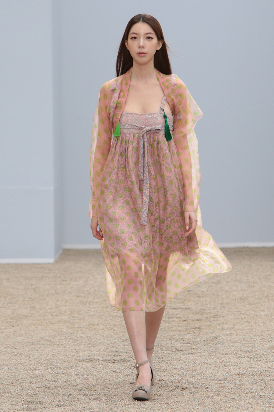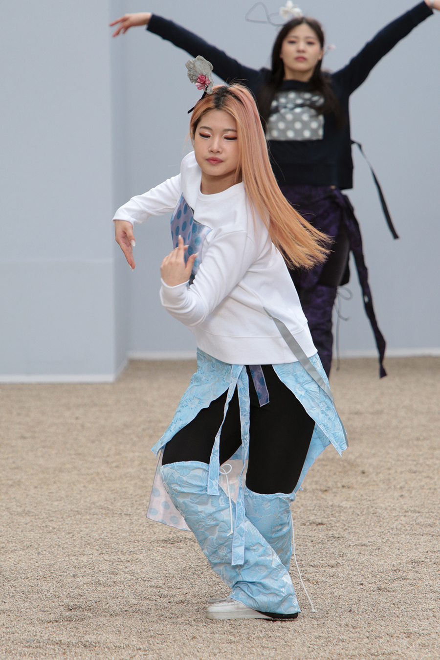 한국 전통의상의 고름을 형상화한 스트렙과 타이 디테일, 후수를 형상화한 플린지 웨이스트 타이 피스 디자인 디테일 등으로 움직임에의 자유로움을 표현. 타이 다이드 나일론 소재의 스트랩으로 셔링의 양을 자유로이 표현할 수 있는 패딩 디자인으로 루틴한 패턴으로부터의 자유와 정형화된 형태로 부터의 자유로움을 표현하였습니다.