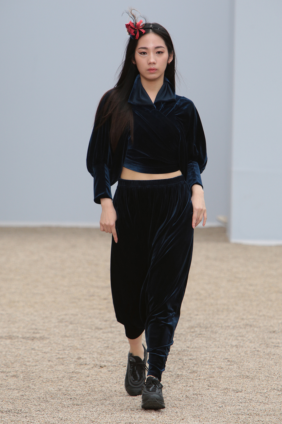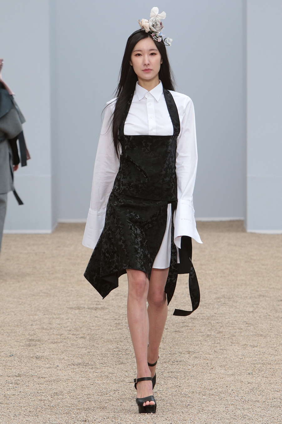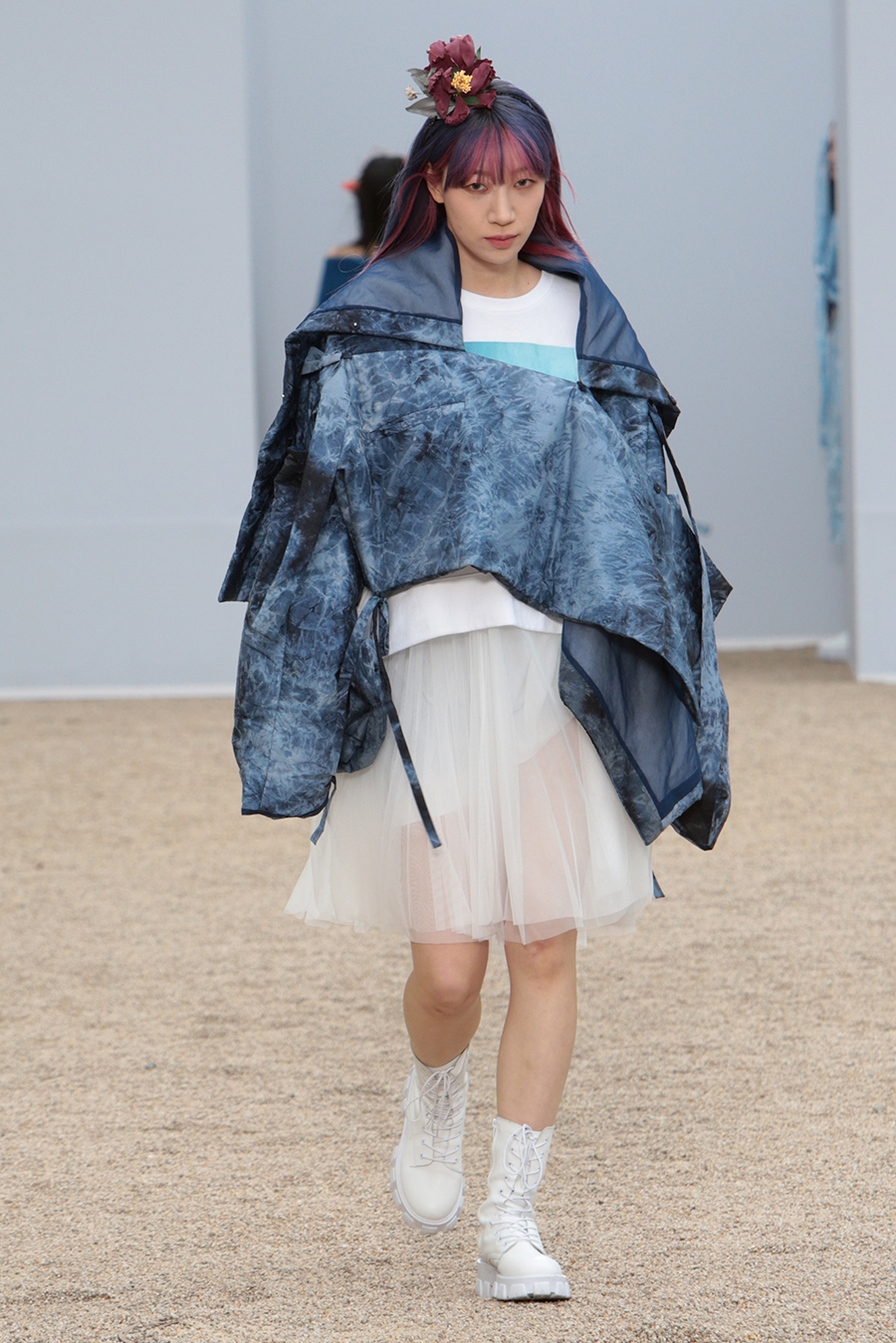 한국 전통의상의 고름을 형상화한 스트렙과 타이 디테일, 후수를 형상화한 플린지 웨이스트 타이 피스 디자인 디테일 등으로 움직임에의 자유로움을 표현. 타이 다이드 나일론 소재의 스트랩으로 셔링의 양을 자유로이 표현할 수 있는 패딩 디자인으로 루틴한 패턴으로부터의 자유와 정형화된 형태로 부터의 자유로움을 표현하였습니다.