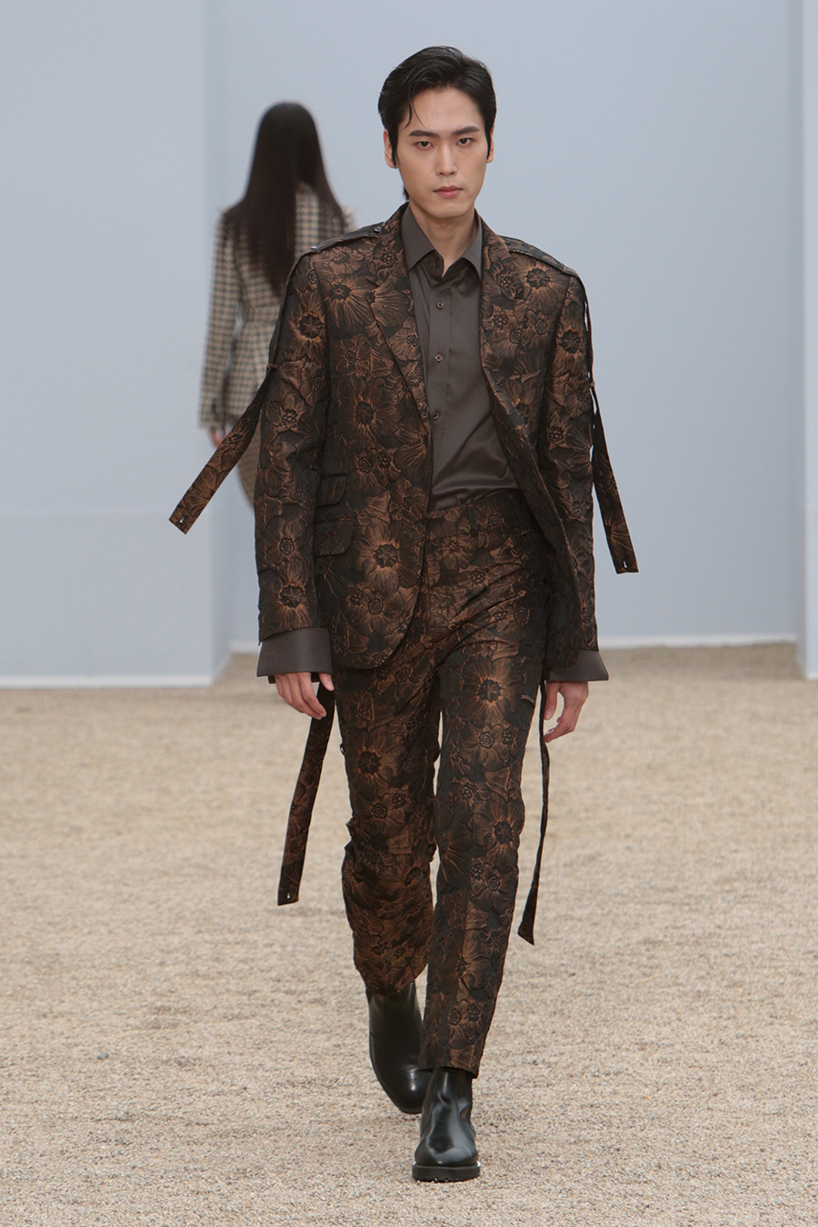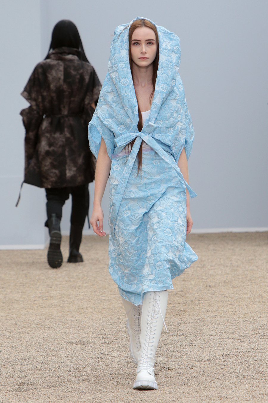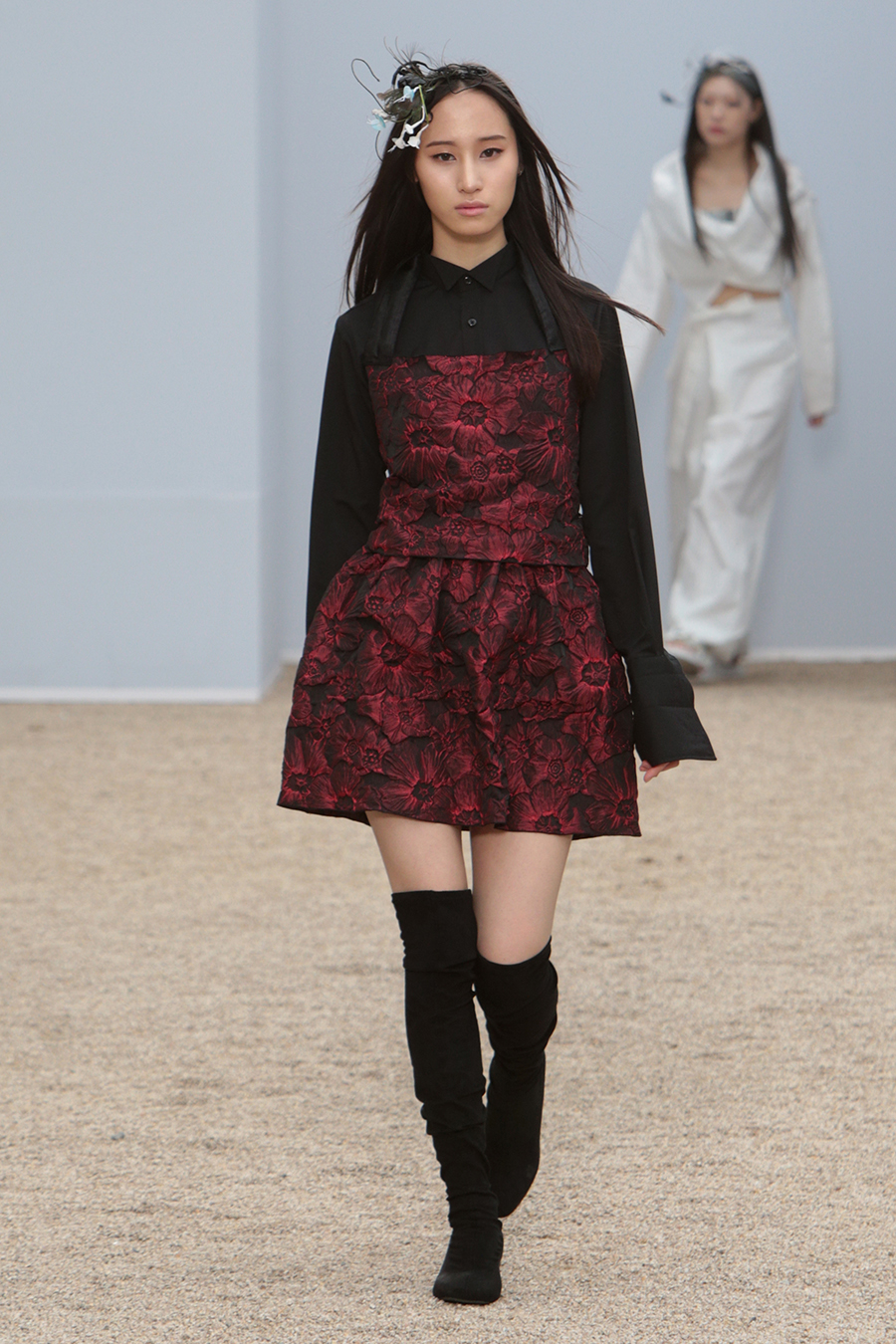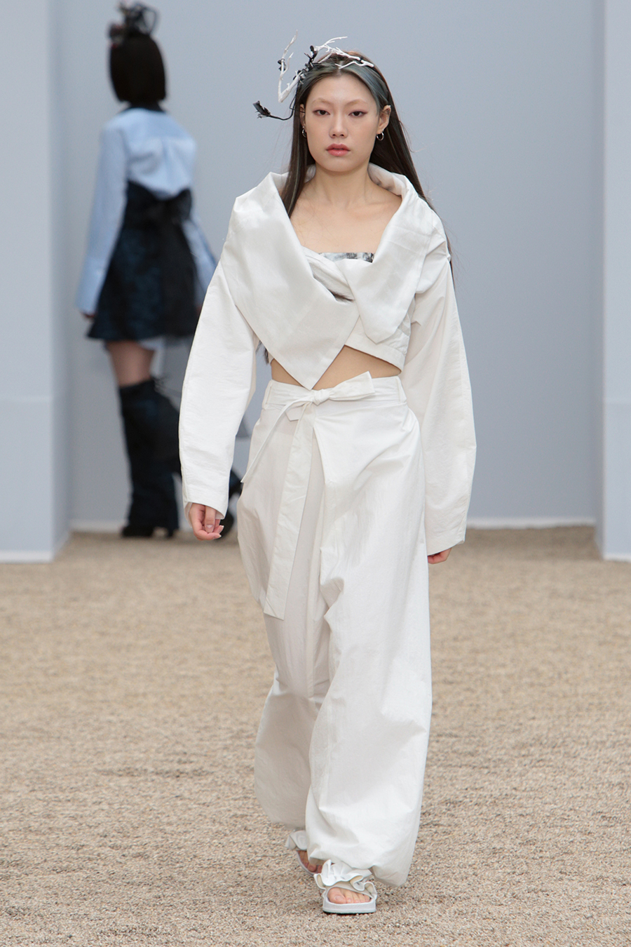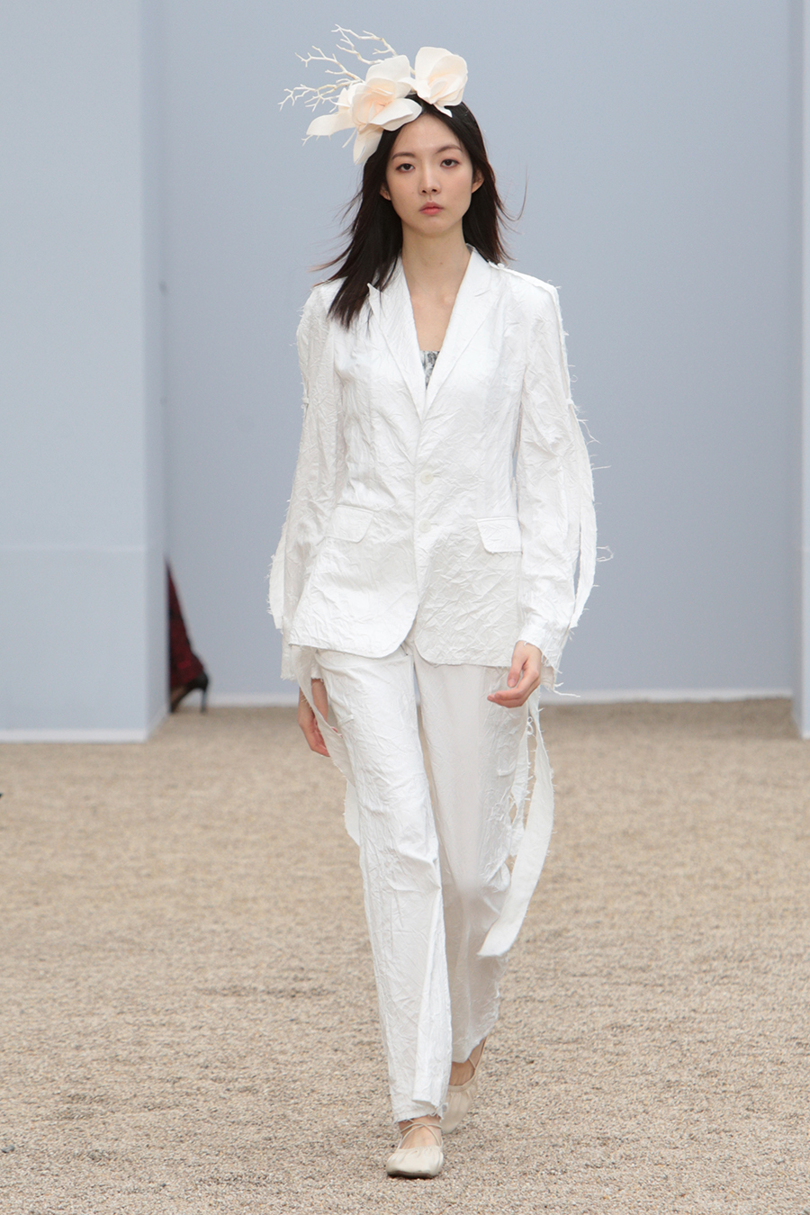 2022 F/W ‘이제는 결연히 이겨내고 아름답게 자유하자’. 김홍도 화백의 무동 속 춤추는 소년을 모티브로 주변 공기의 움직임과 옷 입는 이의 움직임에 따라 자유로이 움직이는 디자인을 표현. 현재의 어떠한 상황에도 영향받지 않는 유연함으로 자유하는 나를 표현. 막히지 않은 로에지와 플린지 디테일을 사용한 디자인으로 어디에도 메이지 않는 자유함을 표현. 표면에 자유로이 클링클과 플리츠를 잡은 소재의 사용으로 정형화된 어떤 것들로부터의 자유를 표현하였습니다.